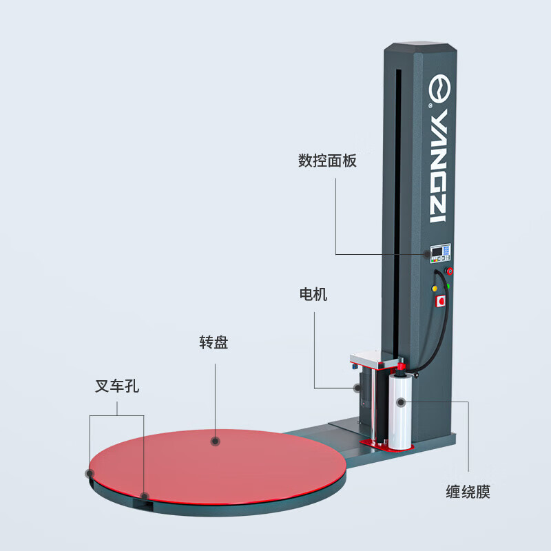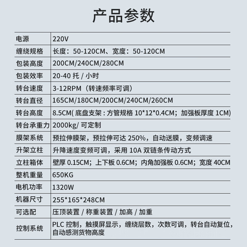 智能全自動纏繞機,2噸超大承重,加厚大托盤堅固更耐用,強勁動力高效銅芯電機,數(shù)控顯示屏方便調節(jié)操作簡單。